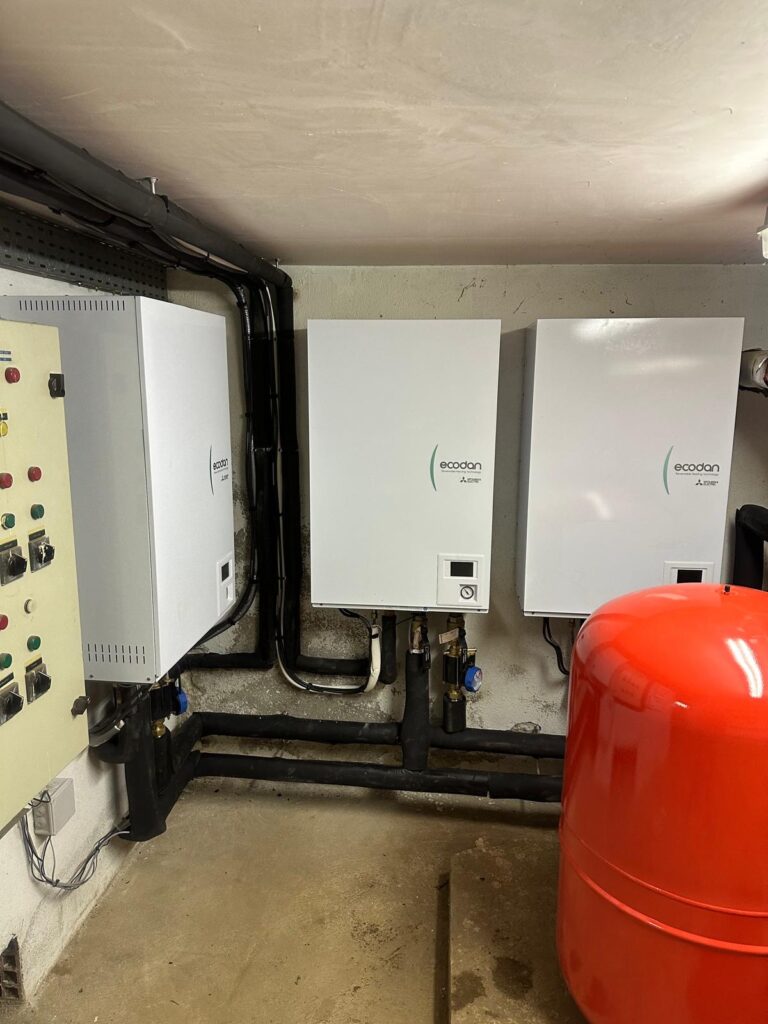 • Une installation principale composée de 3 pompes à chaleur air/eau de 23 kW chacune, fonctionnant en cascade, permettant une optimisation des performances énergétiques et une continuité de service.